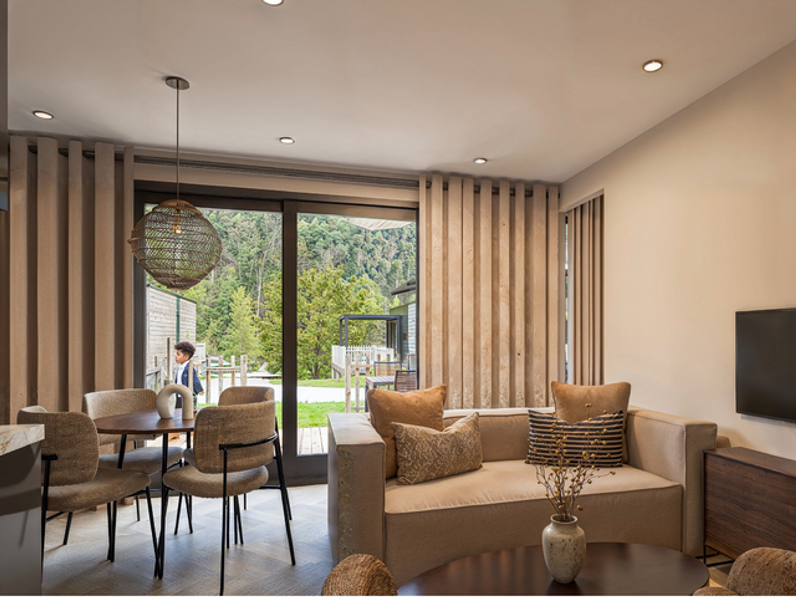 The lodge features an atmospheric living room with direct access to the generous terrace where indoors and outdoors blend seamlessly. The modern kitchen is fully equipped with high-quality appliances and finished with attention to detail so that cooking becomes a real pleasure.