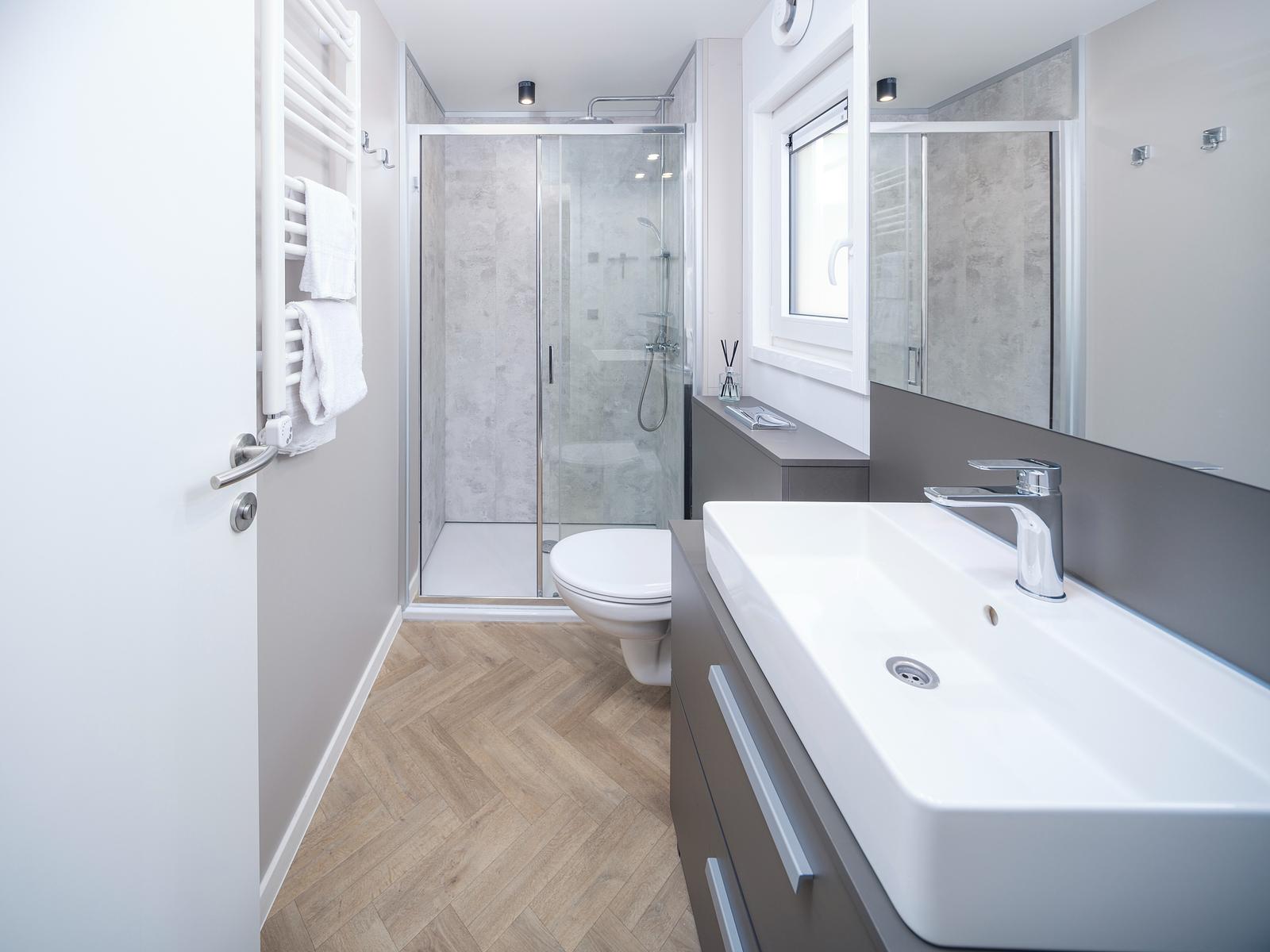 The property features two comfortable bedrooms, accessible via the hallway. The modern bathroom includes a spacious shower, a washbasin cabinet, and a toilet. The living room provides direct access to the terrace, where you can enjoy the peaceful green surroundings—and unwind in your very own private hot tub. The covered veranda also ensures a sheltered spot to sit.